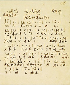 青年反復(fù)朗誦歌詞,在心里記下朗誦時(shí)聲調(diào)的高低、抑揚(yáng)、強(qiáng)弱和節(jié)奏的變化,并在腦海中迅速將這些靈光乍現(xiàn)的樂思和旋律匯集起來(lái),終于形成了完整的樂段。僅一天時(shí)間,這首“獻(xiàn)給廿九軍大刀隊(duì)”的《大刀進(jìn)行曲》便從他心底噴涌而出。這位青年,就是在黨領(lǐng)導(dǎo)下的“國(guó)防音樂”運(yùn)動(dòng)中成長(zhǎng)起來(lái)的青年作曲家麥新。