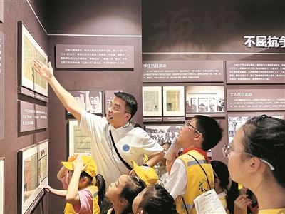 “擔負起天下的興亡——中國共產(chǎn)黨領導下的南京人民抗日斗爭檔案文獻展”在江蘇省南京市檔案館展出。圖為近日,志愿者在為參觀的孩子們講解。 叢偉 攝