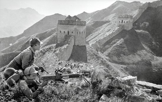 這是八路軍攻克淶源縣日軍據(jù)點東團堡,戰(zhàn)士們在長城烽火臺上歡呼勝利。新華社發(fā)(資料圖片)