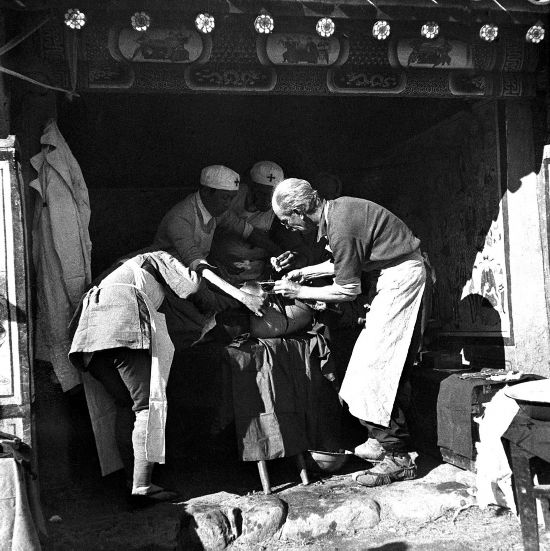 這是白求恩在晉察冀邊區(qū)淶源縣臨時手術(shù)室里為傷員做手術(shù)。新華社發(fā)(資料圖片)吳印咸 攝
