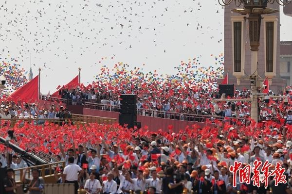今天的天安門廣場(chǎng),80年前的勝利與14年間的抗戰(zhàn),不斷在人們眼前閃現(xiàn)。年號(hào)臺(tái)上有14只和平鴿的雕塑;聯(lián)合軍樂隊(duì)的隊(duì)形設(shè)置了14個(gè)排面、80名禮號(hào)手;26架直升機(jī)組成巨大的“80”字樣隊(duì)形從上空飛過(guò);飛機(jī)拉出14道彩煙,代表14年抗戰(zhàn)歷程,也代表14億中國(guó)人民“奔向強(qiáng)國(guó)復(fù)興的光明前景”。