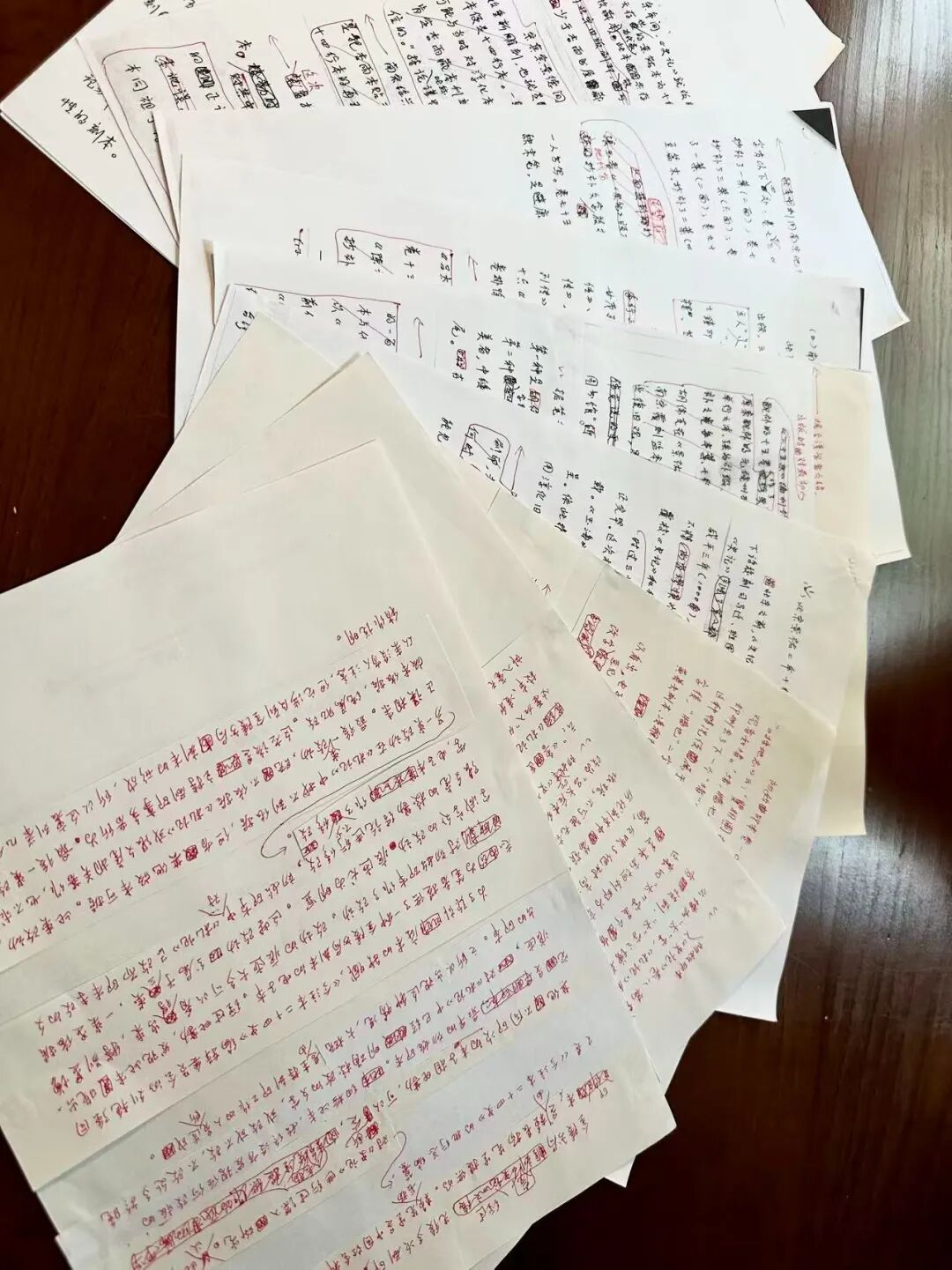 比A4還小的16開紙上,空隙處塞滿了紅色的黑色的小字。底稿寫不下,在旁邊貼紙條,還不夠,就在紙條上貼紙條。最多一頁貼了3000字。內(nèi)容全是手寫,怕打字員打錯,每個字都一筆一畫。