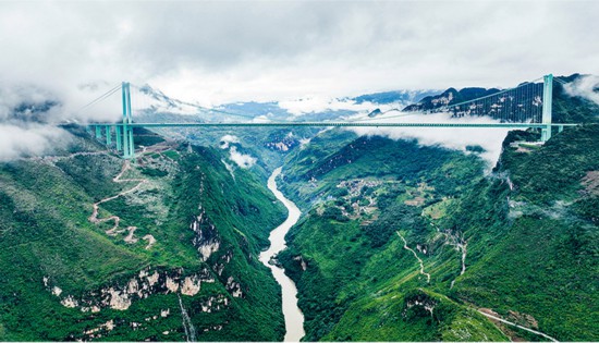 “十四五”時期,我國綜合立體交通網(wǎng)主骨架“6軸7廊8通道”加速完善,基礎(chǔ)設(shè)施網(wǎng)絡(luò)更加系統(tǒng)完備。2025年9月28日,貴州花江峽谷大橋建成通車。大橋全長2890米,主跨徑1420米,是目前世界山區(qū)峽谷第一大跨度鋼桁梁懸索橋;其橋面距水面垂直高度625米,是新的世界第一高橋。圖為9月26日拍攝的貴州花江峽谷大橋。 新華社記者 歐東衢/攝