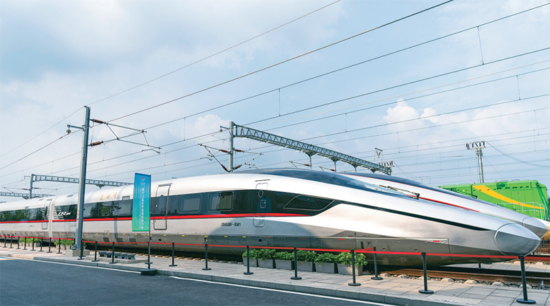 “十四五”時(shí)期,以CR450動(dòng)車組為代表的一項(xiàng)項(xiàng)重大技術(shù)裝備項(xiàng)目取得新進(jìn)展、實(shí)現(xiàn)新突破。CR450動(dòng)車組試驗(yàn)速度可達(dá)450公里/小時(shí),運(yùn)營(yíng)速度可達(dá)400公里/小時(shí),是全球跑得最快的高鐵。圖為2025年7月9日,在國(guó)家鐵道試驗(yàn)中心展區(qū)拍攝的CR450BF動(dòng)車組。 新華社記者 才揚(yáng)/攝